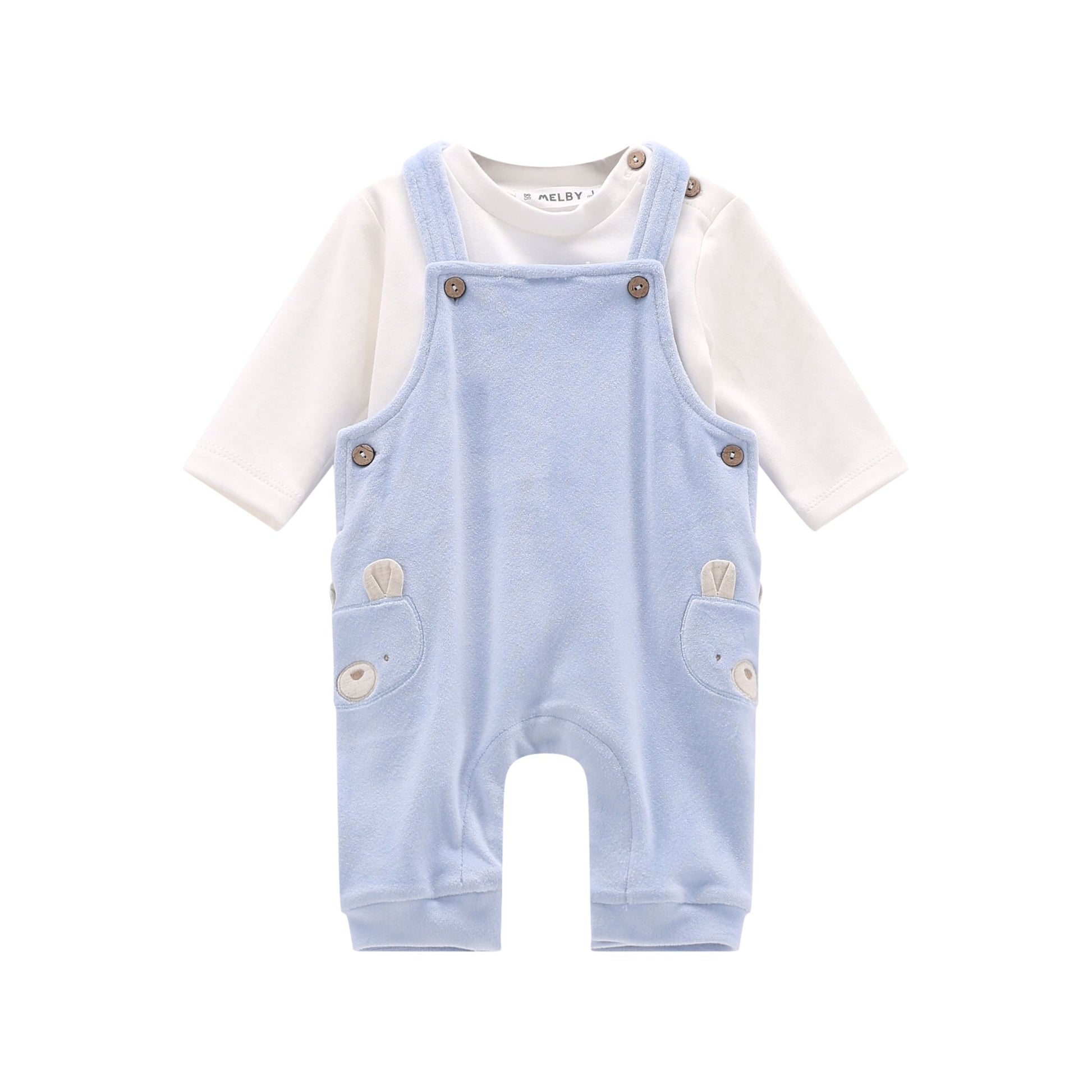 Completo composto da maglia in interlock stretch e salopette in ciniglia soft.