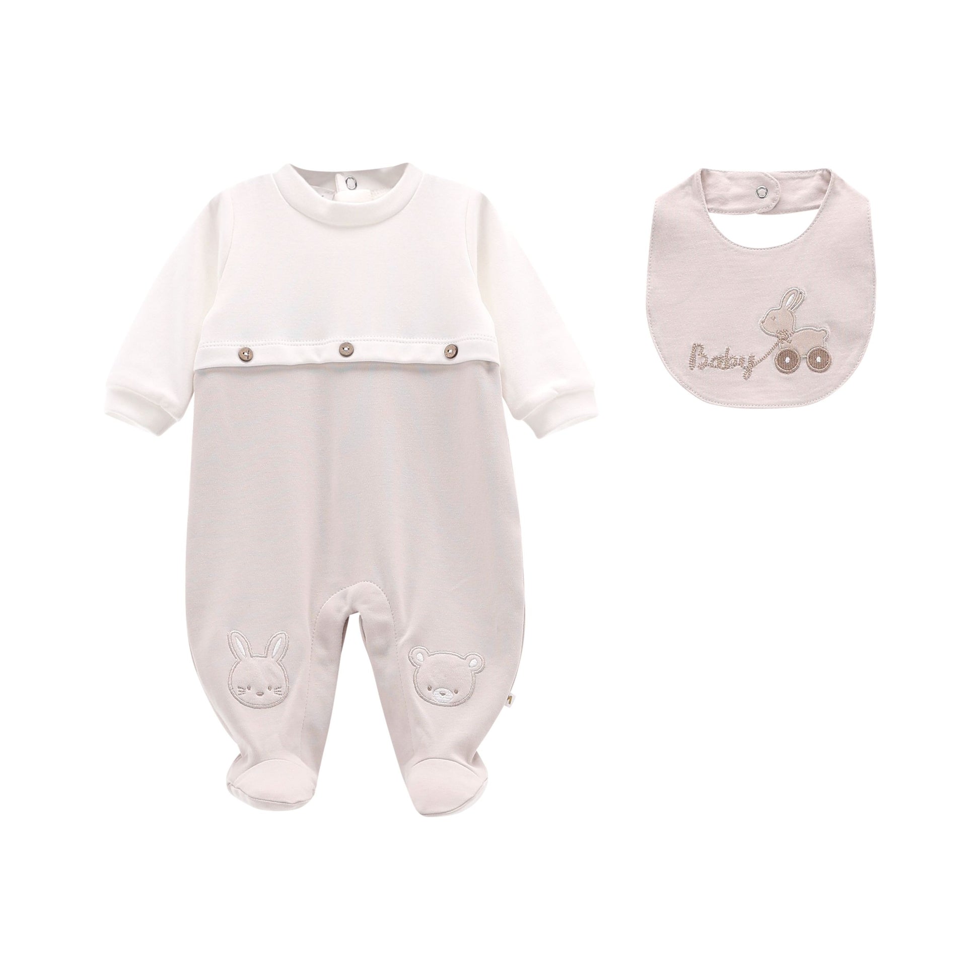 Tutina con piede in interlock stretch e bavetta in jersey.