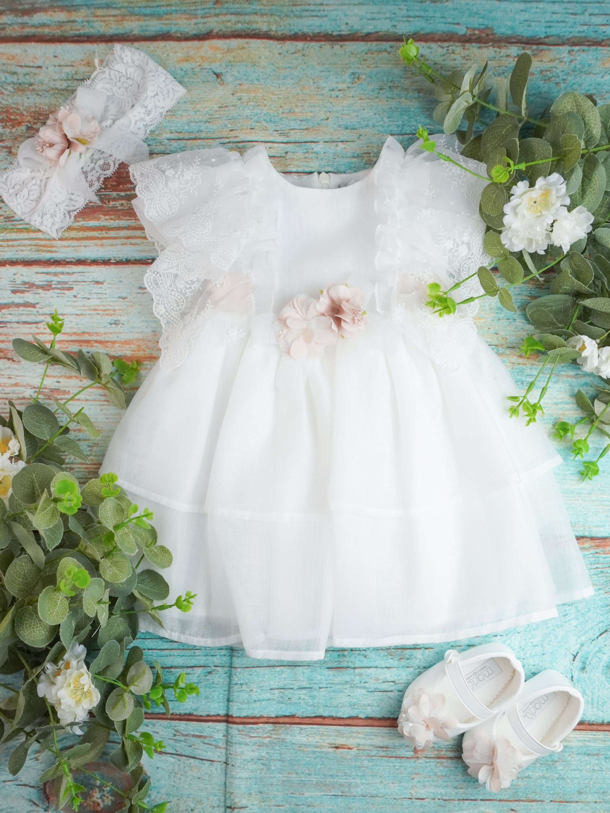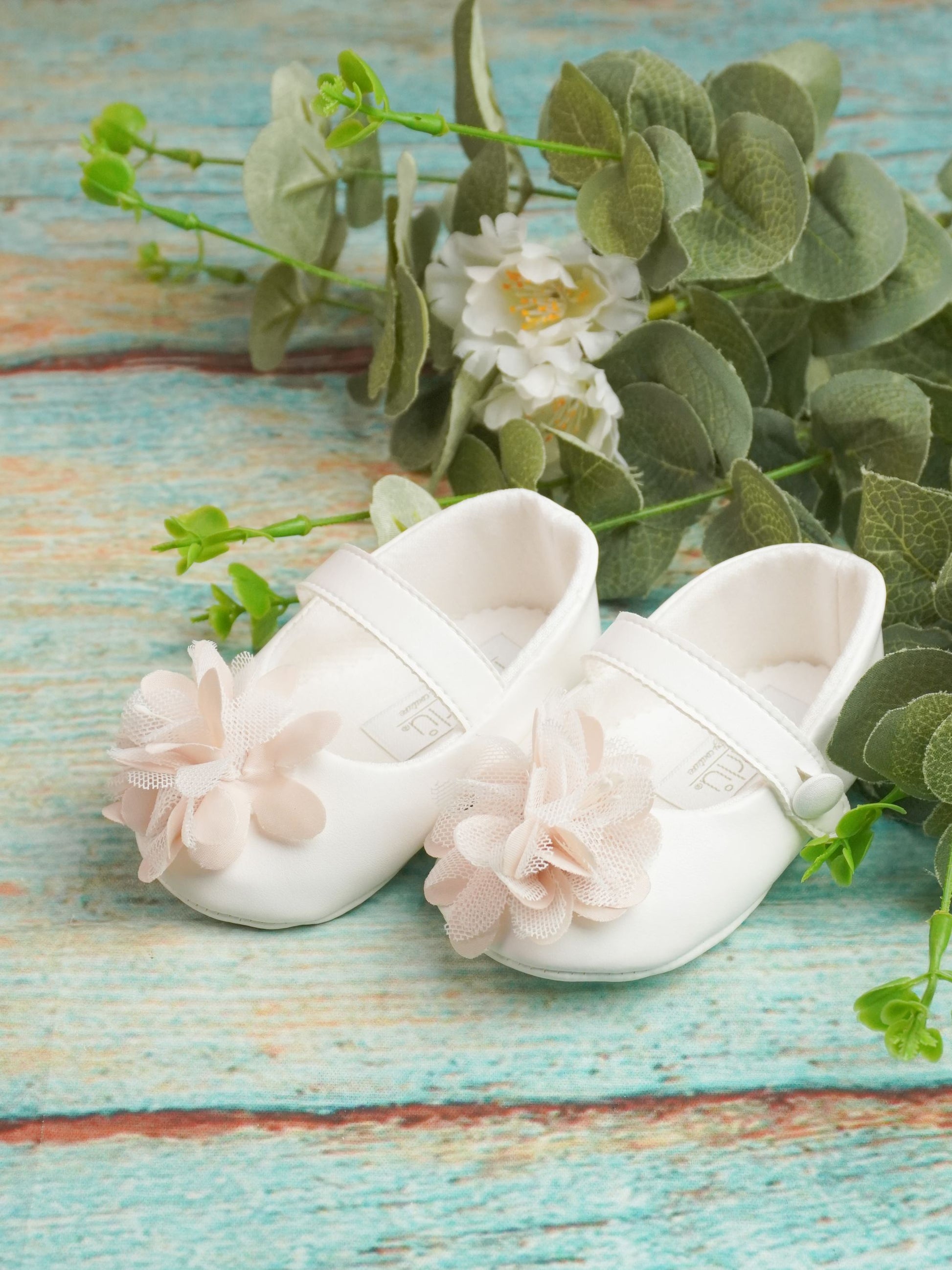 In ecopelle, con fiore applicato in abbinamento con il suo abito battesimale.